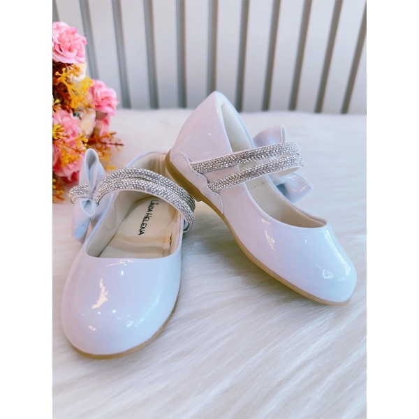 * Sapatinho infantil na Cor Branco Verniz, Aplique de Lacinho e Tiras com Strass Luxo!