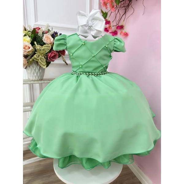 Vestido Infantil Verde Cinto de Pérolas Casamento Luxo